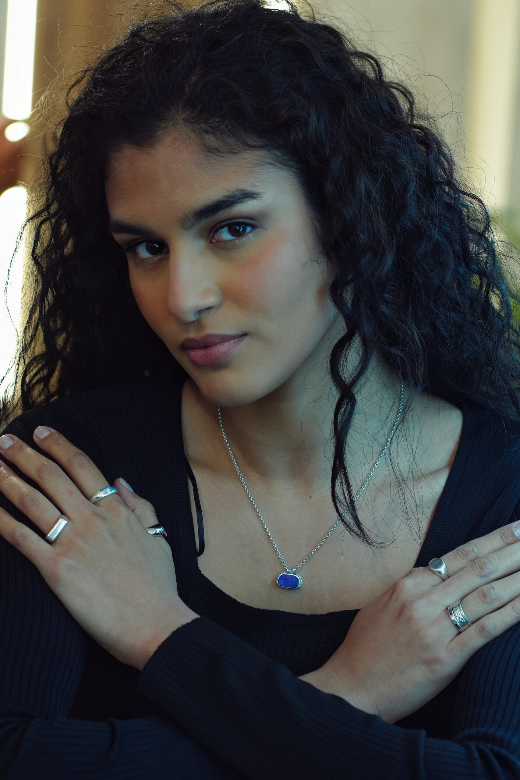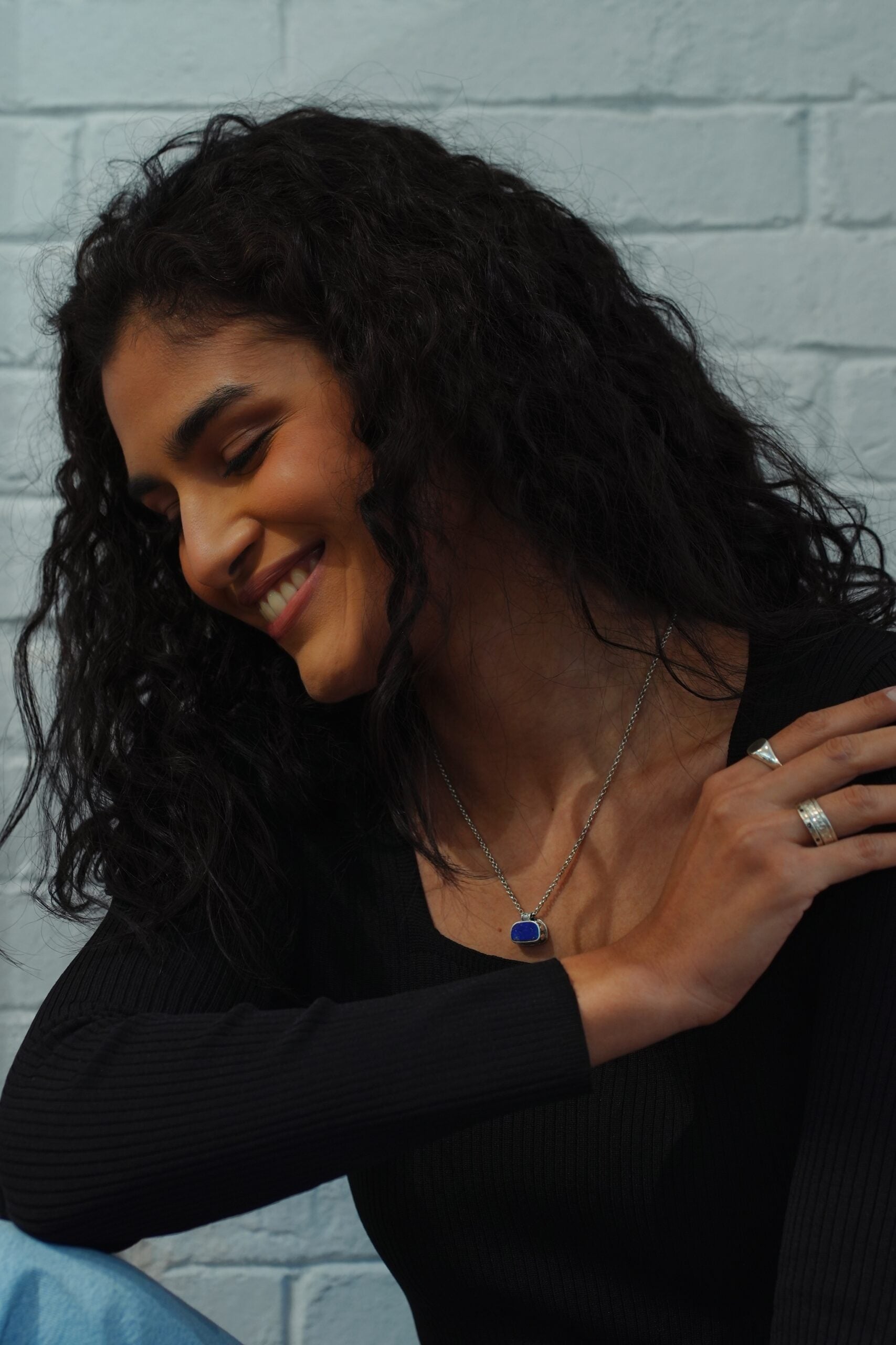 Front: Adorned with a mesmerizing lapis lazuli stone, this side of the pendant radiates a deep blue hue, symbolizing wisdom, truth, and inner peace.